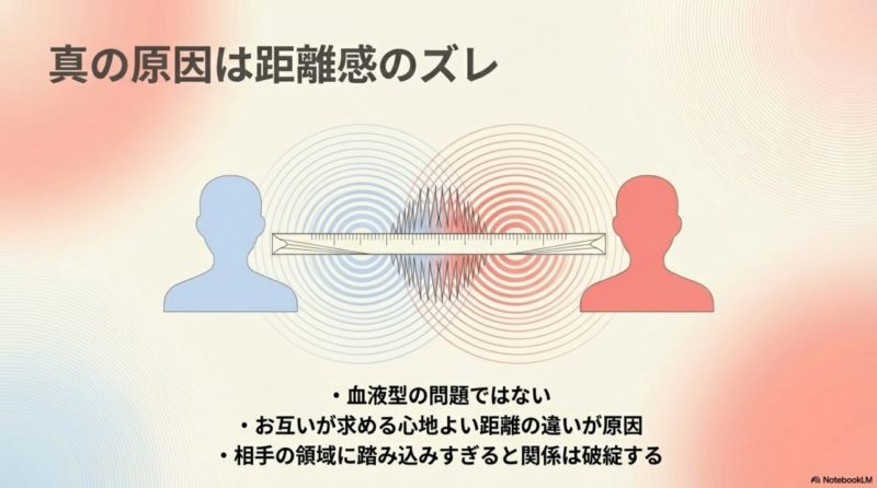 さらに、ab型の論理性が強く出ると、b型は正論で追い詰められているように感じやすいです。 b型は感情の熱量で動く面があるので、正しさだけで詰めると関係がこじれやすいです。 ab型は整理して話しているつもりでも、b型には“逃げ場がない会話”に聞こえることがあるんです。 こうなると、b型は話し合いを避けるようになり、ab型はさらに理解されない感覚を深めやすくなります。