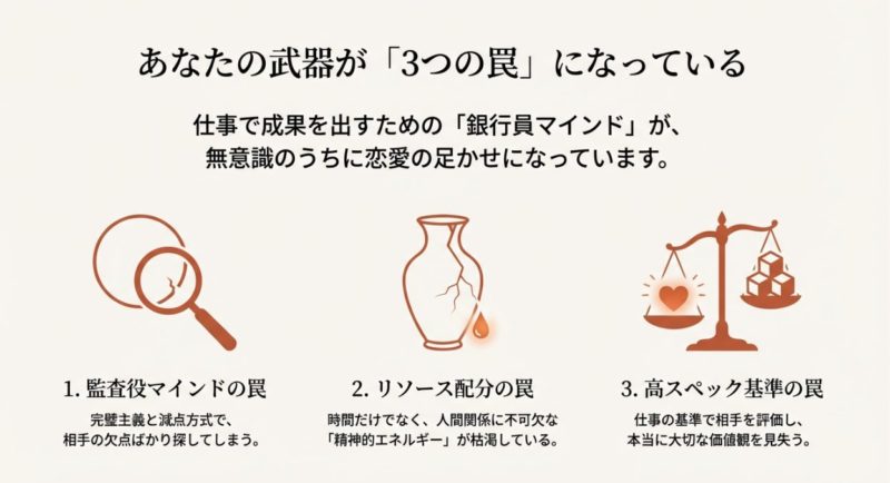 慎重さは銀行員としては超強い武器ですよね。  リスクを見て、最悪を想定して、手順を踏む。  でも恋愛だと、その慎重さが「脈がないのかな」「温度感が低いのかな」に見えてしまうことがあります。  相手はあなたの慎重さを理解していないので、放っておくと“冷たい”判定になりやすいです。