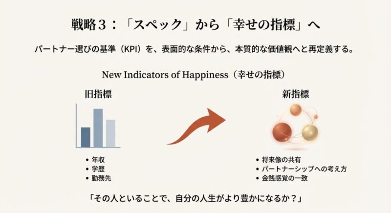 私のおすすめは、KPIを「年収」単体から、転勤への理解、家事育児の参加意欲、精神的な安定に分散させること。  ここを変えると、候補が現実的に増えます。  しかも、このKPIって結婚生活の満足度にも直結しやすいです。