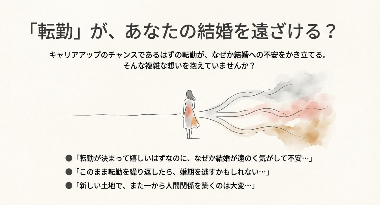 転勤の悩みを深掘りしたいなら、サイト内の全国転勤で結婚できないと感じる理由と対策も合わせて読むと整理しやすいです。