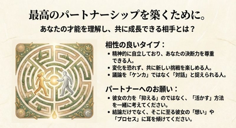最初から相性の良い土俵で勝負するほうがラクです。 強さを理解してくれる人、尊重してくれる人、そしてあなた自身も相手の価値観を尊重できる関係。 この組み合わせが一番強いです。