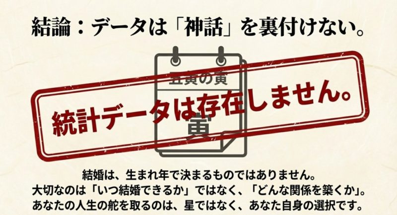 結論として、五黄の寅だから結婚できない、という断定はおすすめしません。 少なくとも、公的データで「五黄の寅は未婚率が有意に高い」と言い切れる材料は見当たりにくいです。 だから不安の正体は、運勢よりも性格の出方と、相手選びと、関係設計にあることが多いと思います。