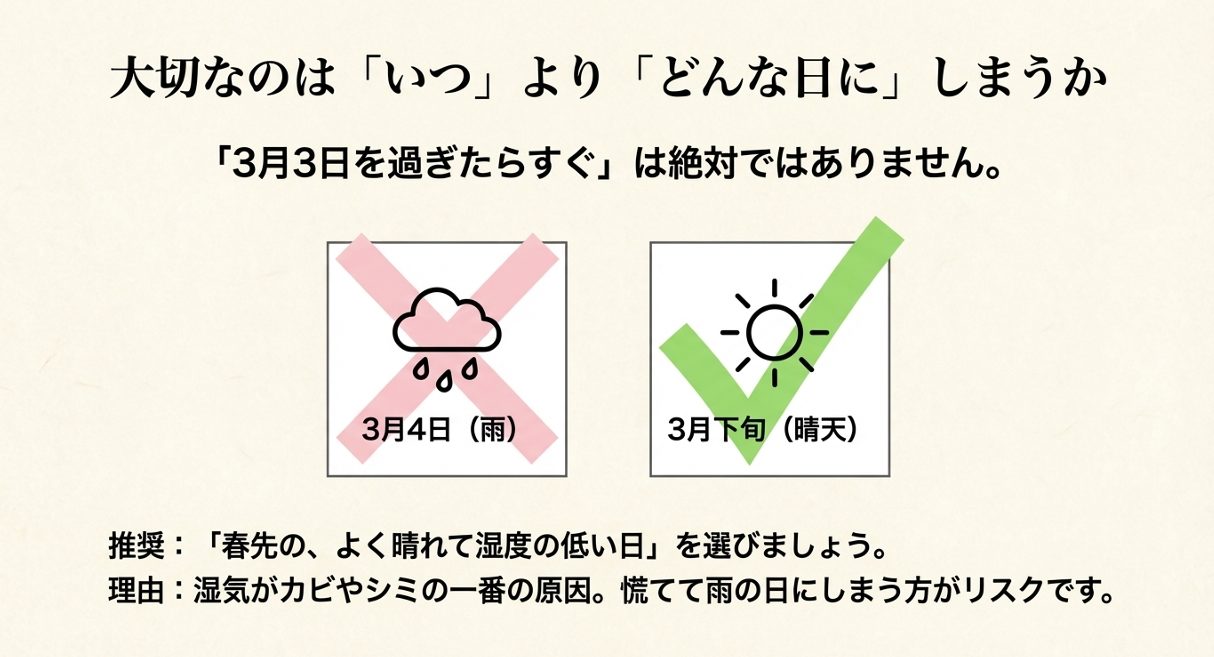 基本は晴れて乾燥した日を選ぶのが大事で、タイミングとしては3月3日が終わってから、天気の良い日に片付ければ問題ありません。  地域によっては、旧暦や月遅れで4月に雛祭りをするところもありますし、あなたが住んでいる場所の季節感も考えてOKです。  雪国なら、3月上旬はまだ冬っぽいこともあるので、そこは無理しないほうがいいです。