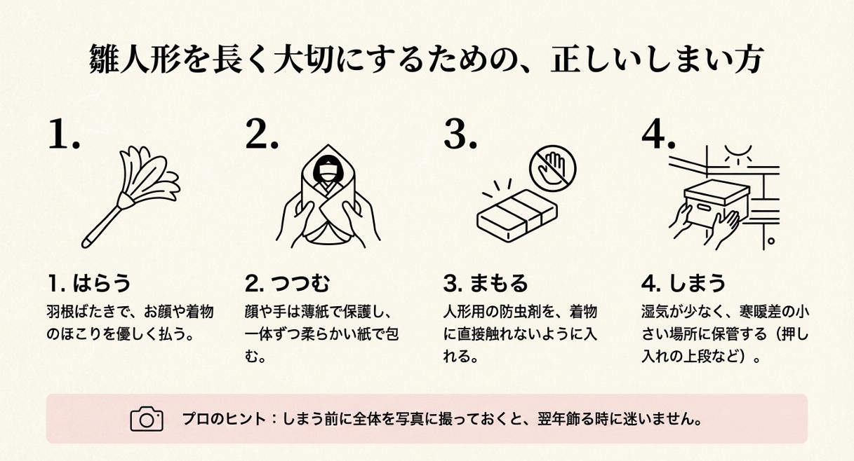 事実として大事なのは、人形は湿気と虫に弱いので、天気の良い日に丁寧に片付けたほうが長持ちする、ということ。  一方、気持ちとして大事なのは、あなたが「やってしまった…」と責め続けないことです。  片付けが遅れた年があっても、人生はそこで決まりません。