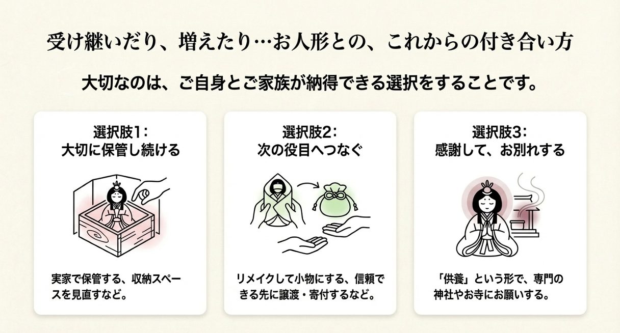 ここからは、実家の雛人形やお下がり、供養・処分、自分用など「どう扱えばいいの?」に答えていきます。  気持ちの整理と、現実的な選択肢をセットでまとめます。