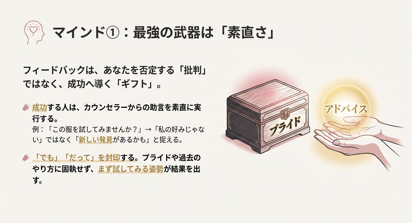 素直さがある人は、フィードバックを“人格否定”として受け取りにくいです。  例えば、担当者に「その条件、少し広げてみませんか?」と言われたときに、「私の価値が低いってこと?」って捉えるのではなく、「成婚までの最短ルートを探ってくれてるんだな」と捉える。  これができると、行動がブレません。