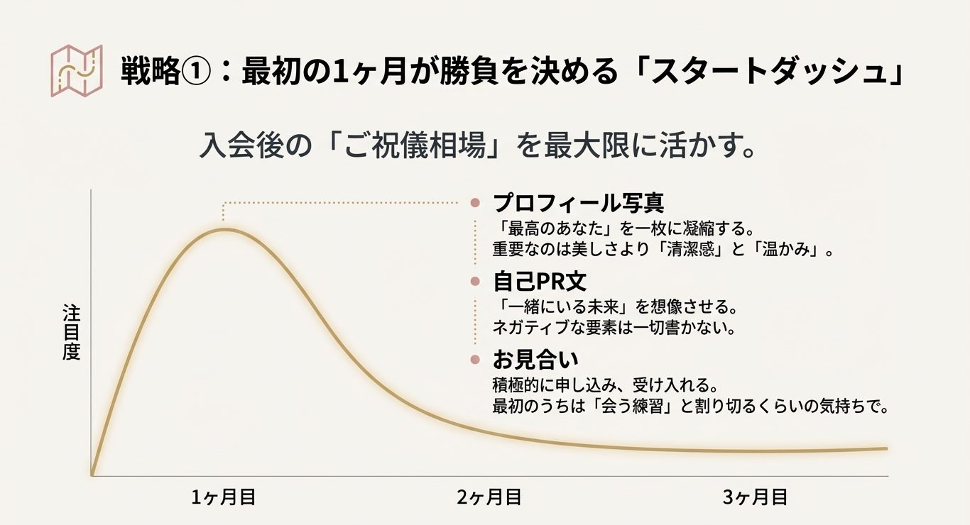 私が何度も言うのは、最初の数か月はゴールデンタイムということ。  新規会員の表示や注目が集まりやすい時期に、活動量で一気に母数を作ります。  短期成婚する人は、ここで“会える状態”を作りきるのが上手いです。