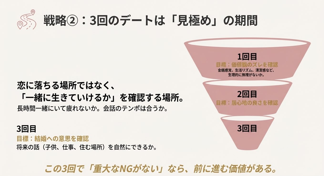 そして3回目デート。  ここは“盛り上げる回”というより、現実的に合うかを見ていく回です。  恋愛っぽいドキドキだけで突っ走ると、後でズレが出るので、3回目くらいから価値観の話を少しずつ混ぜていきます。