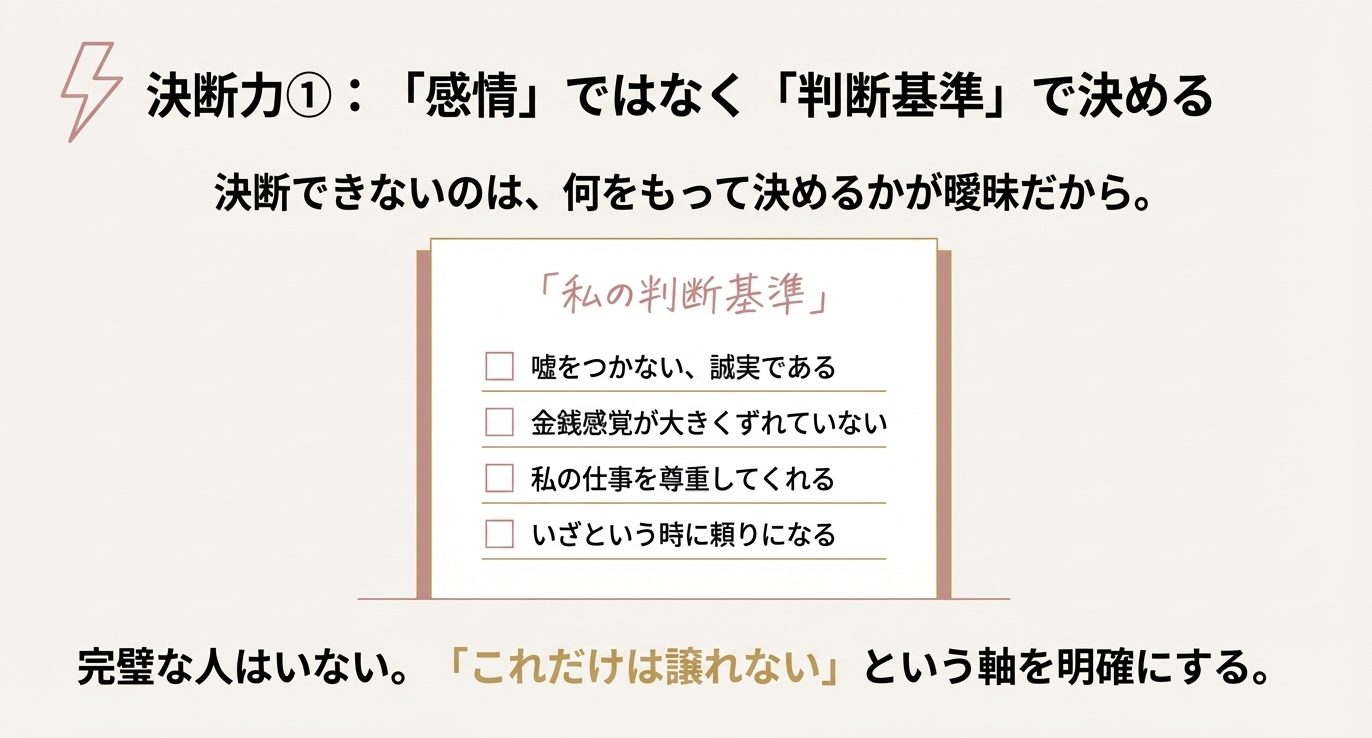 この基準があると、相手の条件が良くても「ここが合わないなら厳しい」と判断しやすいし、逆に完璧じゃなくても「ここが合うなら育てられる」と前向きに決められます。