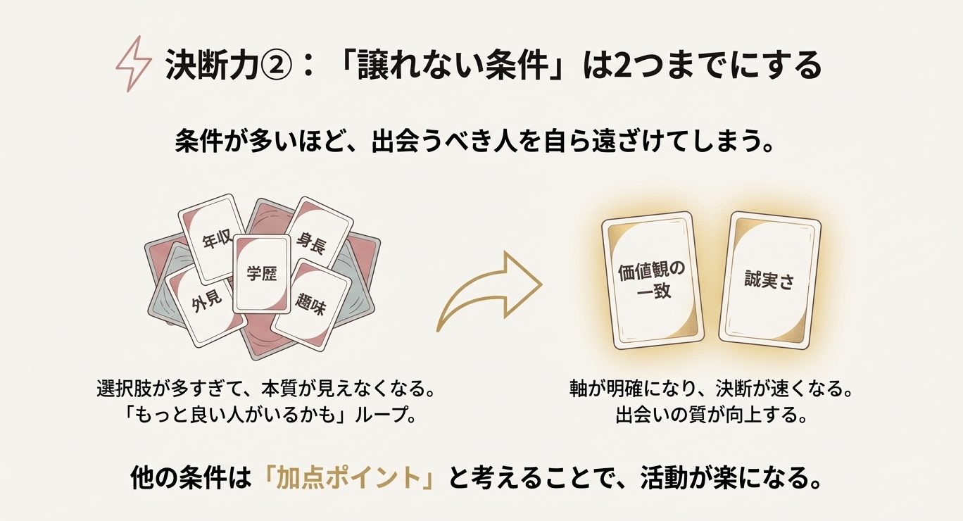 条件を決めるときにおすすめなのは、「欲しい条件」より「困る条件」を先に決めることです。  欲しい条件を積み上げるとキリがないけど、困る条件は意外と少ない。  たとえば、借金があるのは無理、暴言があるのは無理、浪費が激しいのは無理、家族の干渉が強すぎるのは無理。  こういう“無理ゾーン”を決めたうえで、それ以外は会って判断する。  これが、30代40代の短期成婚に強いです。