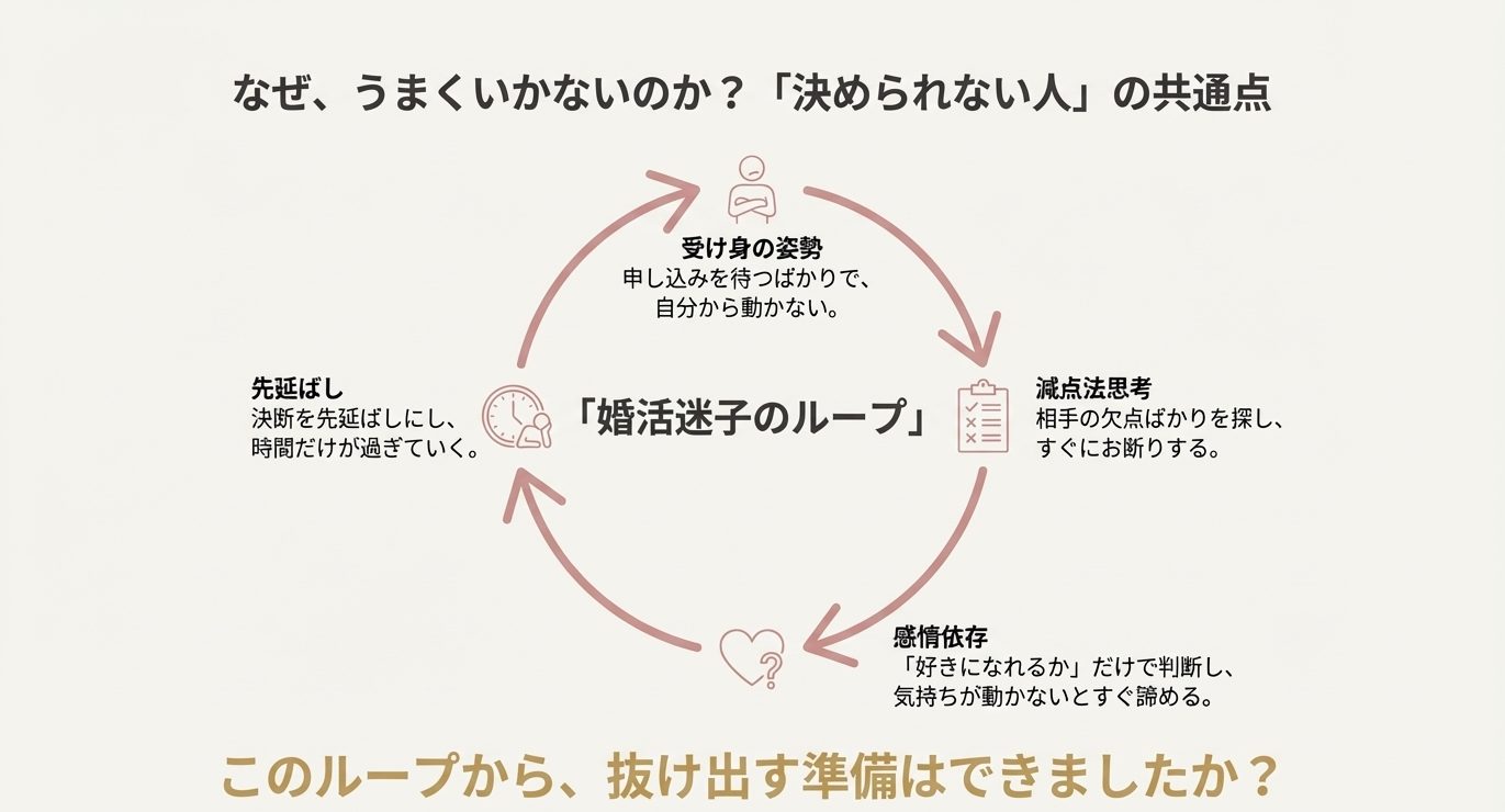 決められない人って、意志が弱いというより、比較しすぎて疲れていることが多いです。  仮交際が複数になると、良い部分と悪い部分が交差して、頭が混乱します。  さらに「この人を選んで失敗したらどうしよう」という責任が怖くなります。  ここ、気になりますよね。