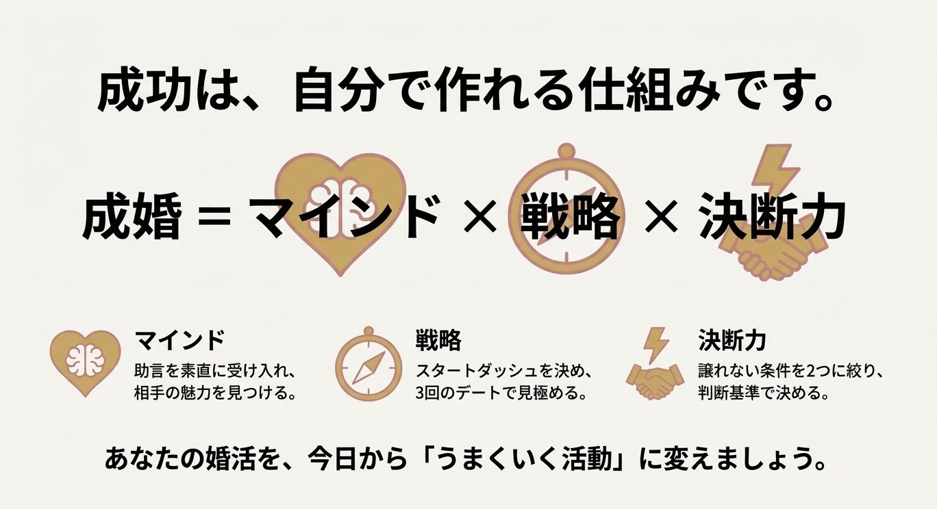 ここまでを回せると、あなたの婚活は“運任せ”じゃなくなります。  短期成婚って、こういう地味な設計の積み重ねで起きるんですよ。