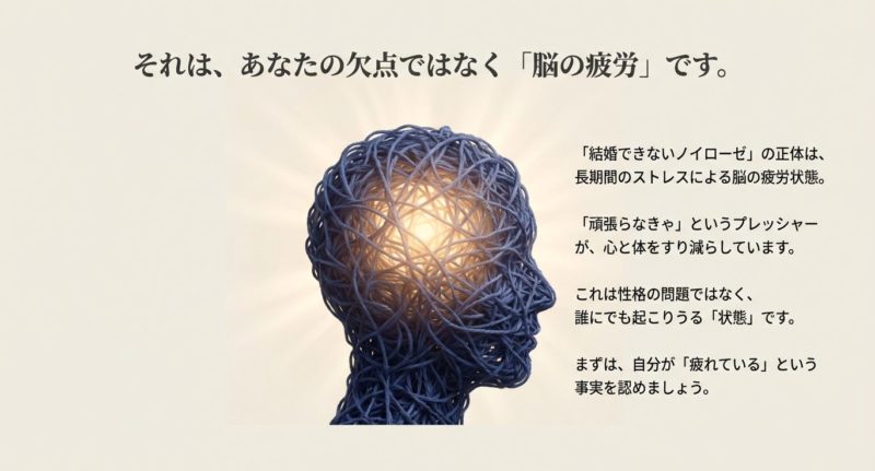 結婚できないノイローゼは、あなたの価値の問題ではなく、心と体が限界に近いサインとして出ている反応であることが多いです。 だから、まずは睡眠・食事・休息を守って、危険なサイン(希死念慮や強い不眠、日常生活の破綻)があるなら、迷わず専門家に頼ってください。