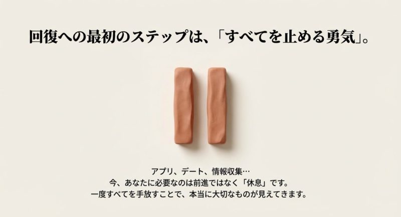 だから私が大事だと思うのは、「婚活を頑張る」より先に、婚活があなたの生活を壊していないかを点検すること。 婚活は人生の一部であって、人生そのものじゃないです。 ここを取り戻すだけで、回復はかなり進みます。