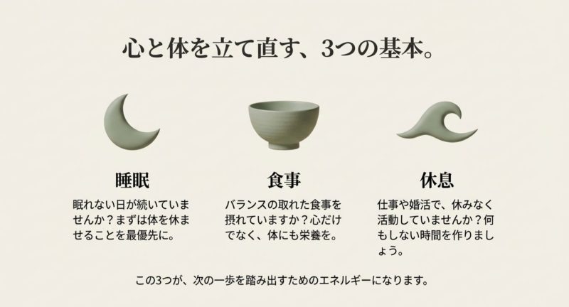 この段階で大事なのは、自己評価を上げようとする前に、まず回復の土台(睡眠・食事・休息)を守ることです。