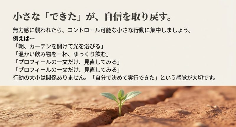 どれも小さいけど、こういう一歩が「自分で自分を助けられる感覚」を戻します。 ここが戻ると、婚活の結果に振り回されにくくなっていきますよ。
