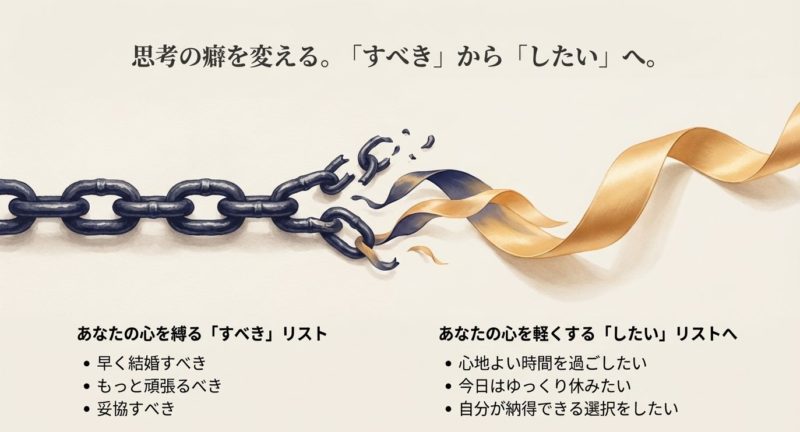 結婚すべき(Must)を、結婚できたらいいな(Want)に戻すだけで、心が呼吸しやすくなります。
