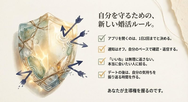 この章は、テクニック集というより「あなたの心が削れにくい運用」に寄せます。 婚活は続け方がすべて。続けられる形に組み替えるのが、結局いちばん早いです。