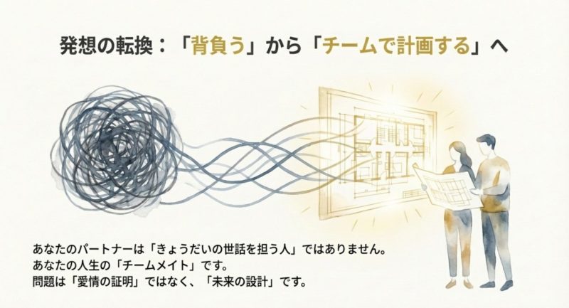 でも、結婚って介護要員を探すイベントじゃないんですよ。  あなたのパートナーは、兄弟の世話を背負う人ではなく、あなたの人生の味方です。  だから、責任を丸ごと渡す発想ではなく、支援を分散する設計を作ればいい。  私はこれを「責任を軽くする」のではなく、「責任を正しく配る」って呼んでます。