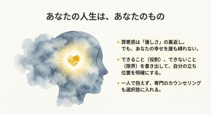ここで私が強めに言いたいのは、罪悪感をゼロにしなくていい、ってことです。  罪悪感って、あなたが家族を大切にしてきた証拠でもあるので、無理に消そうとすると逆に反動が出たりします。  だから、目標は「罪悪感を消す」じゃなくて、罪悪感にハンドルをつけることかなと思います。
