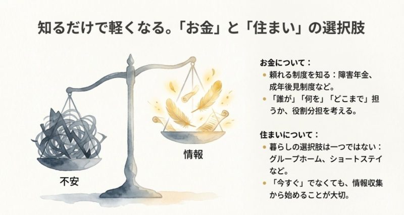 さらに、遺伝の不安、結婚差別や義実家の反対、グループホーム不足と費用、障害基礎年金がいくらか、成年後見制度と家族信託の違い、遺伝カウンセリング費用、カミングアウトの伝え方まで、考えることが多すぎて頭がパンクしそうになることもあります。
