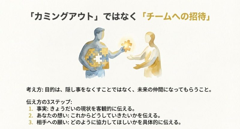 最後にもう一つ。カミングアウトは一回で終わる話じゃないです。  相手の理解は段階的に深まります。  だから、最初は重くしすぎず、でも隠さず、少しずつチームになっていく感じがちょうどいいですよ。