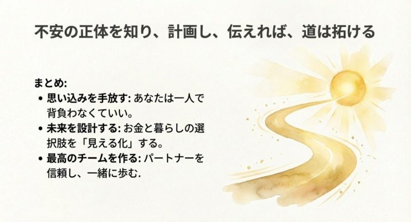 ここで大事なのは、完璧な説明をしようとしないこと。  あなたはプレゼンターじゃなくて、人生を一緒に作る相手に「大事な前提」を共有するだけです。  だから、伝え方は上手いか下手かより、誠実さと、相手の不安に向き合う姿勢が効きます。