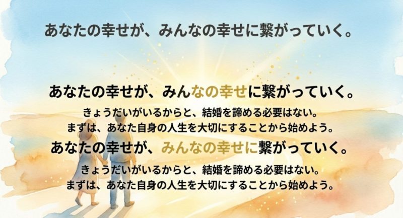 私はここで、まず言い切りたいです。  結婚は、家族を裏切る行為じゃないです。  結婚は「あなたがあなたの生活を作る」こと。  兄弟のことを大事に思う気持ちと、あなたが家庭を持つことは両立できます。  両立させるには、感情だけで頑張るんじゃなくて、仕組みを作るほうがラクです。